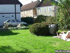 skinny rich old man fucks his busty blonde girlfriend in the garden